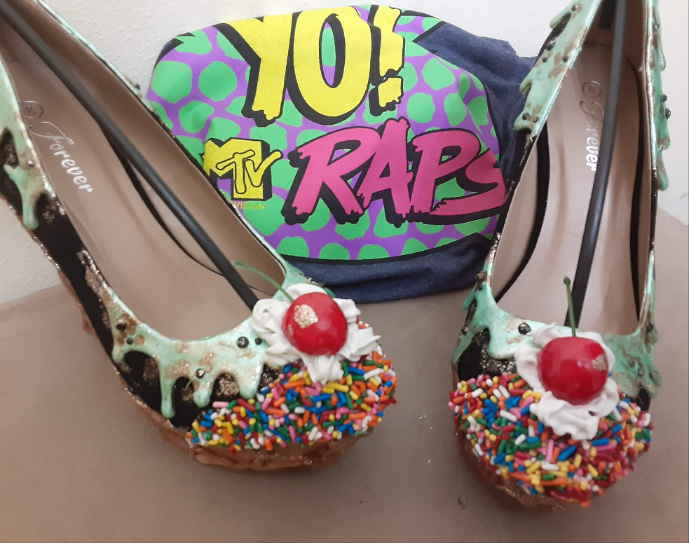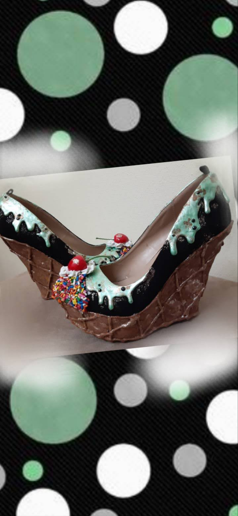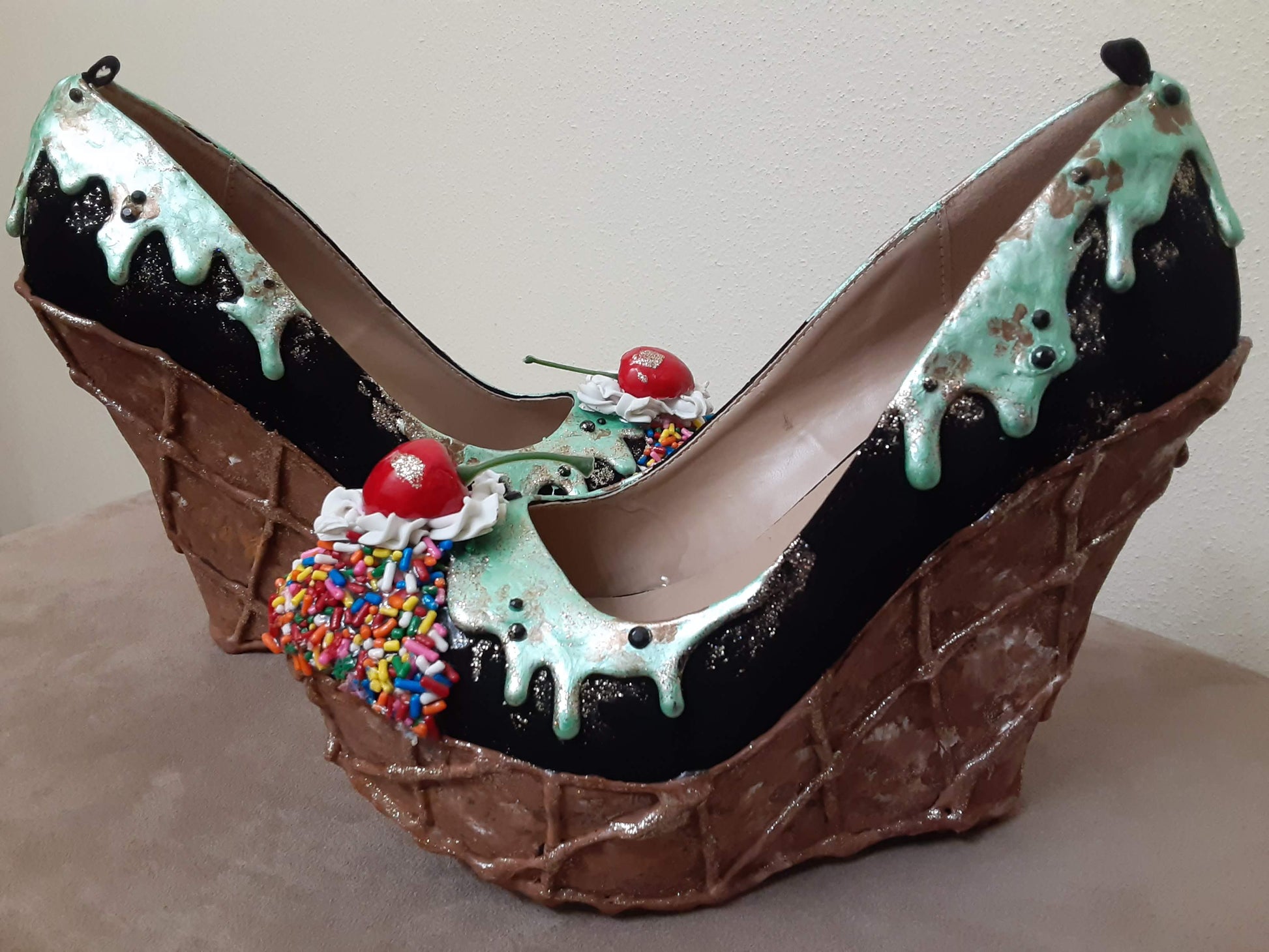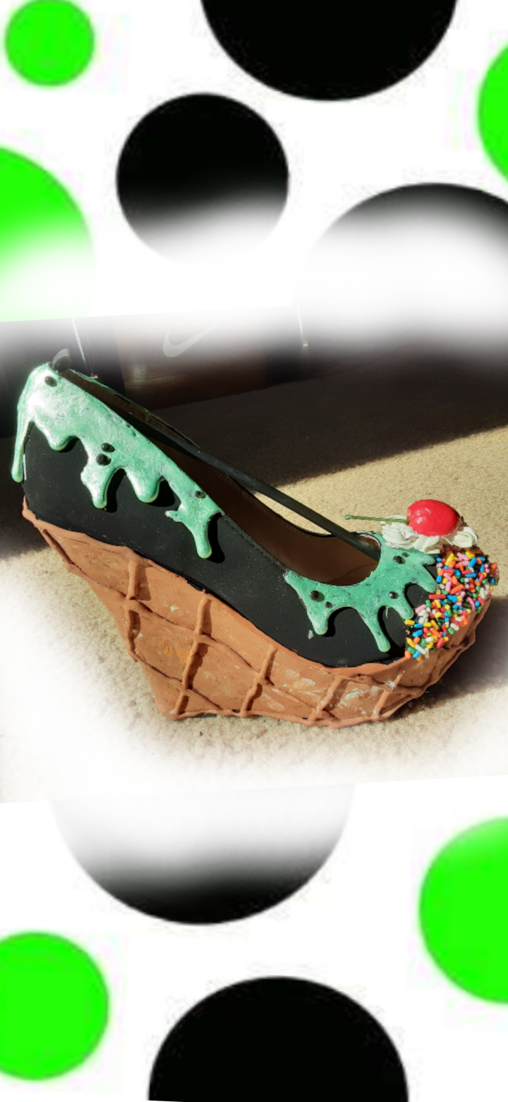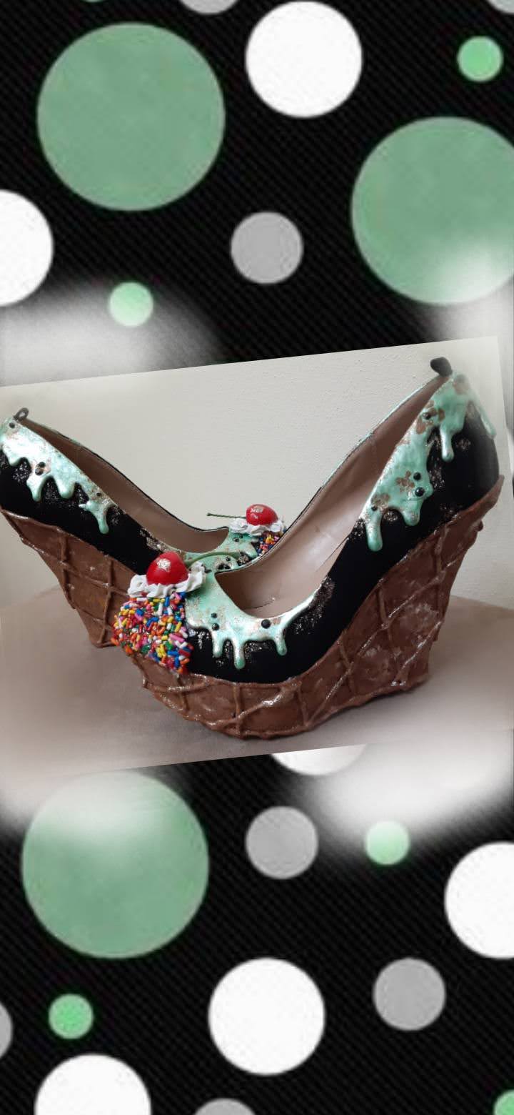 These desserts for your feet are layers of creamy Mint Chocolate Chip ice cream adorned with Sprinkle Topping, faux chocolate chips and creamy Mint ice cream atop a Waffle Cone styled wedge sole and/or heels, a faux cherry AND embellished with REAL SWAROVSKI CRYSTALS!!