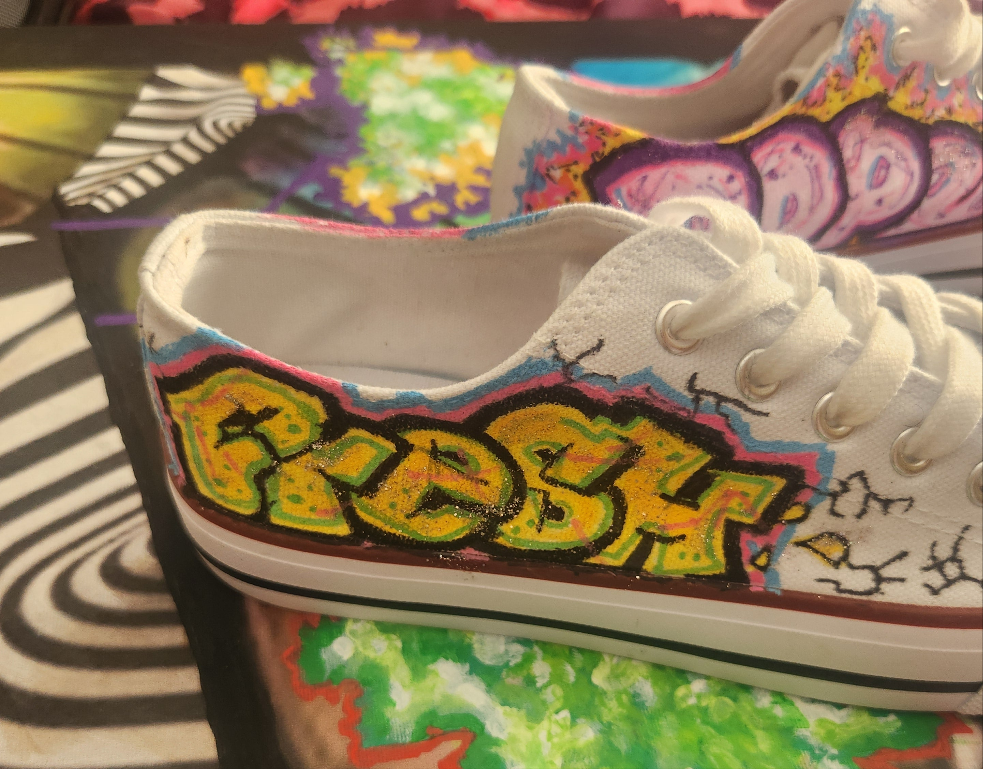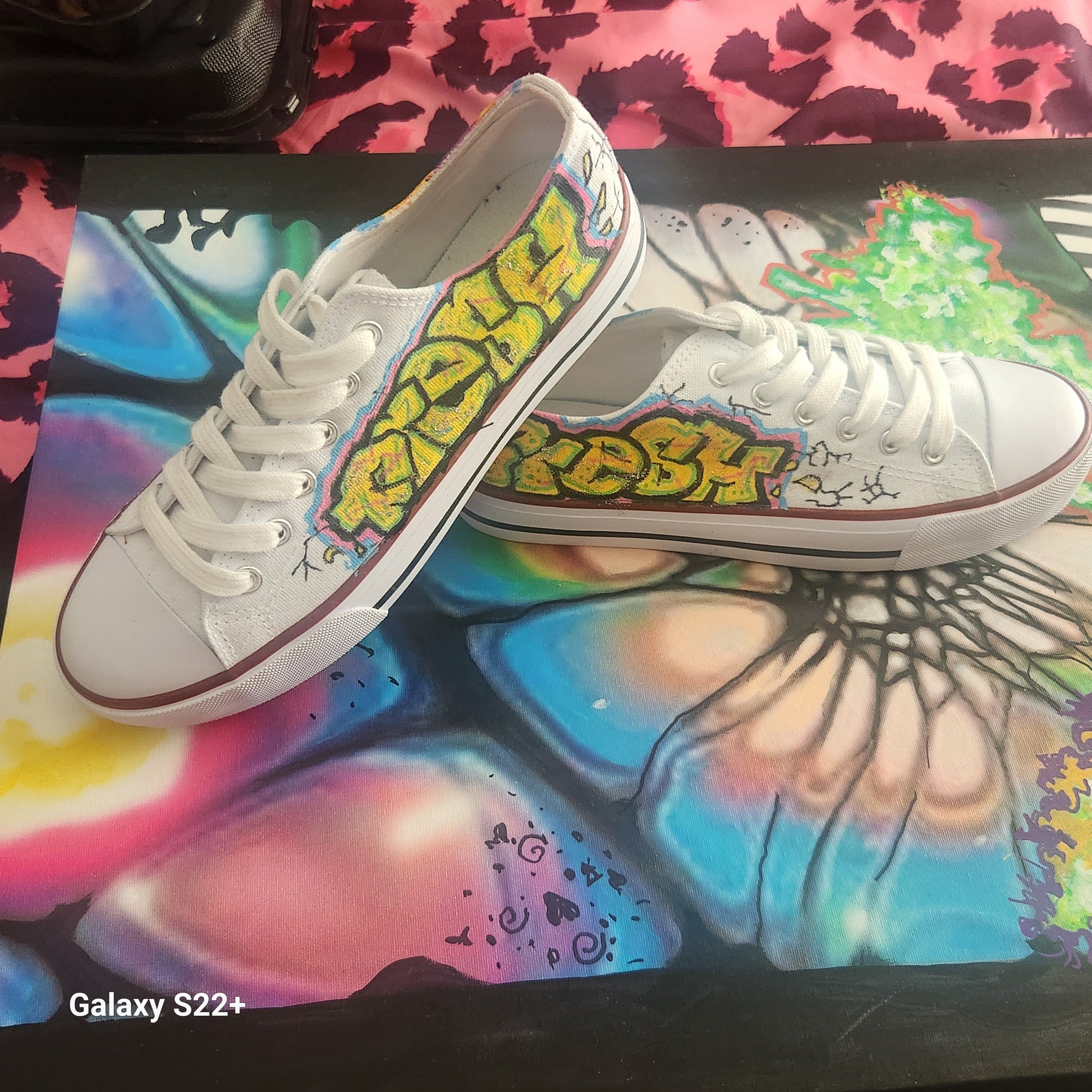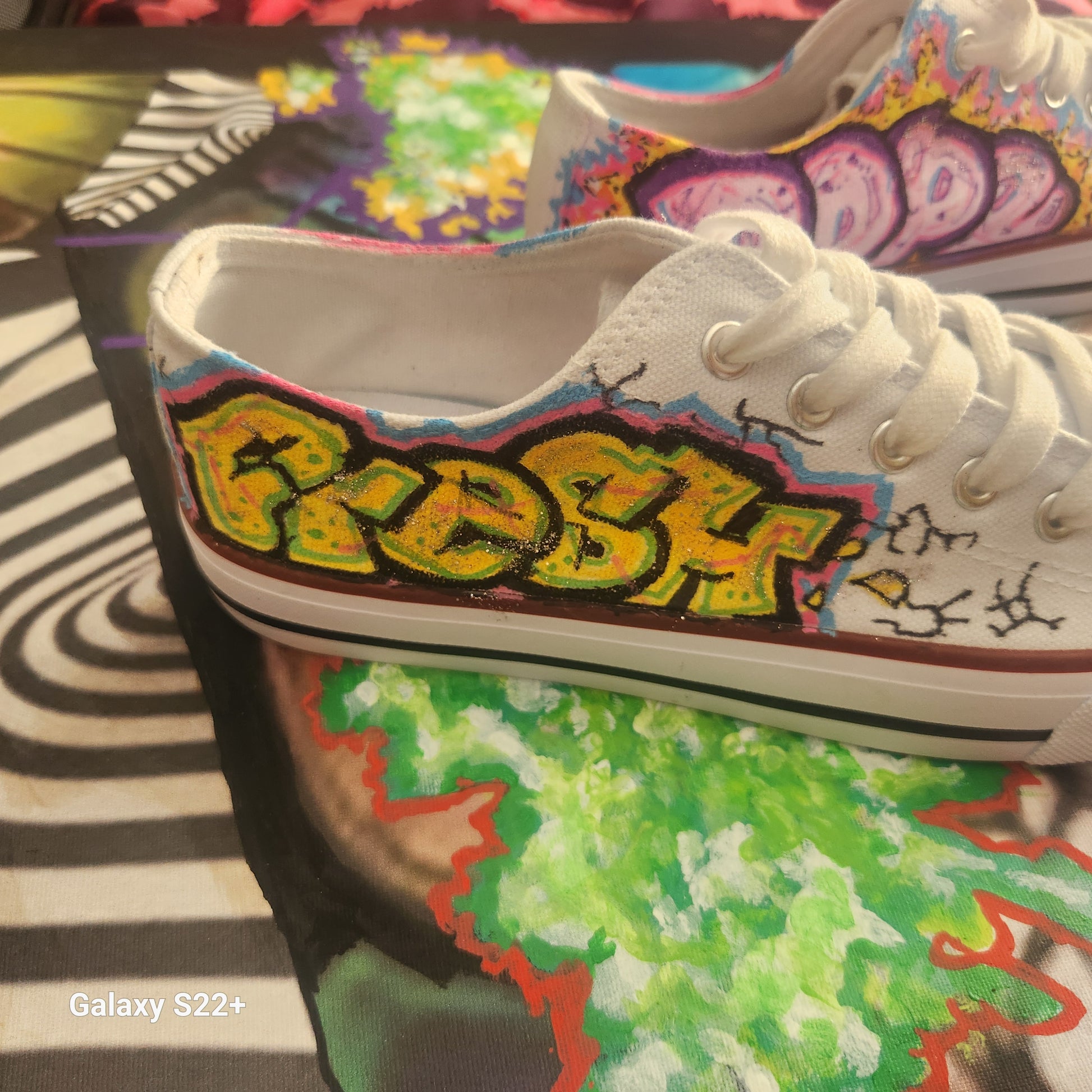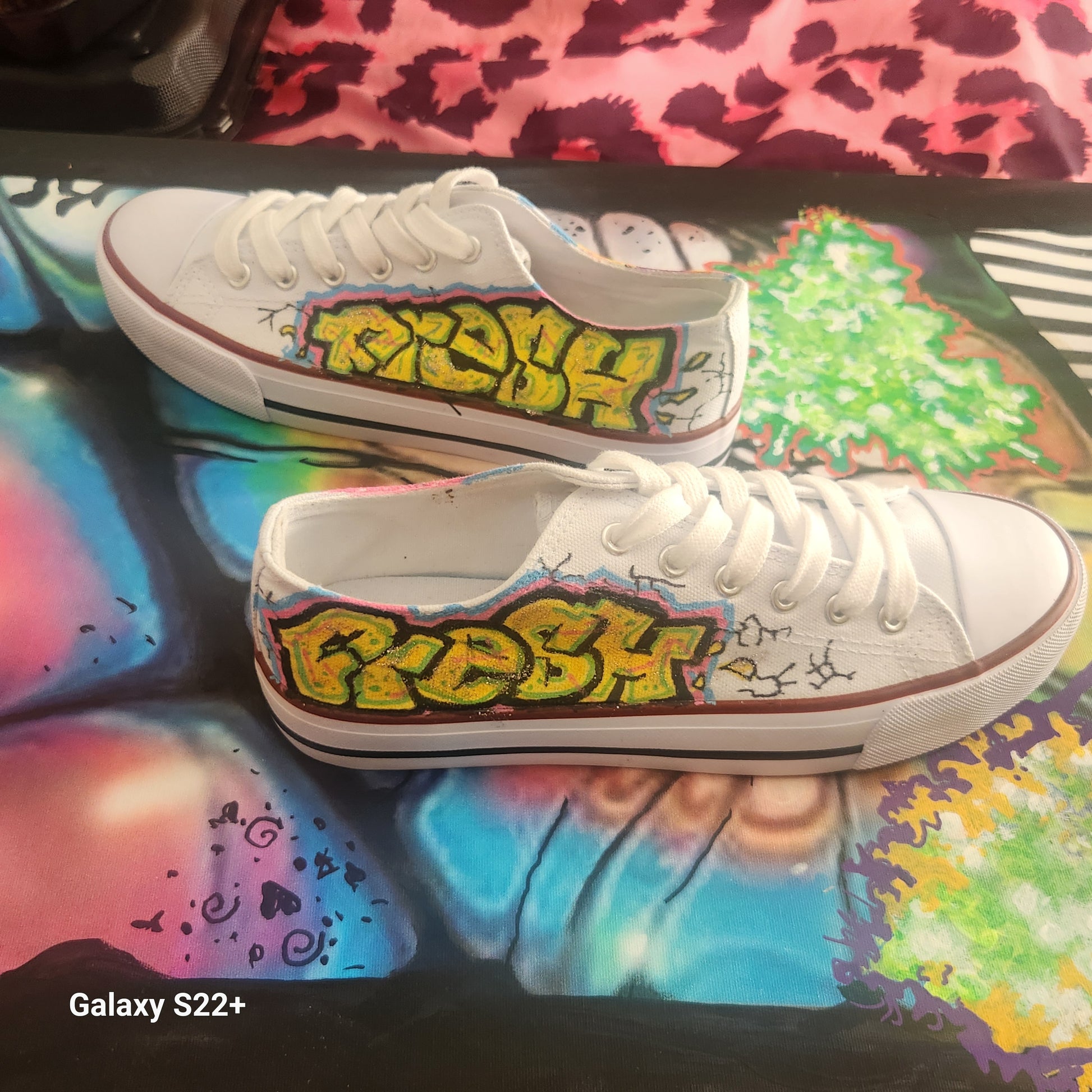 These shoez are customized with the graffitti tag of "Fresh" on outer sole and "DOPE" on instep.