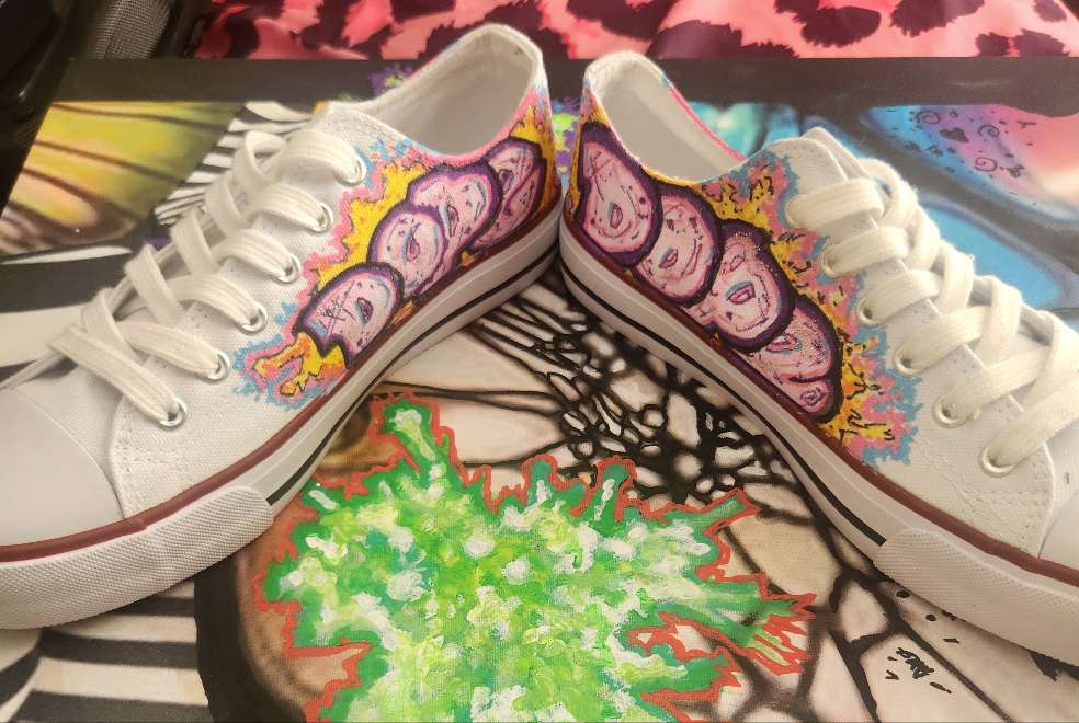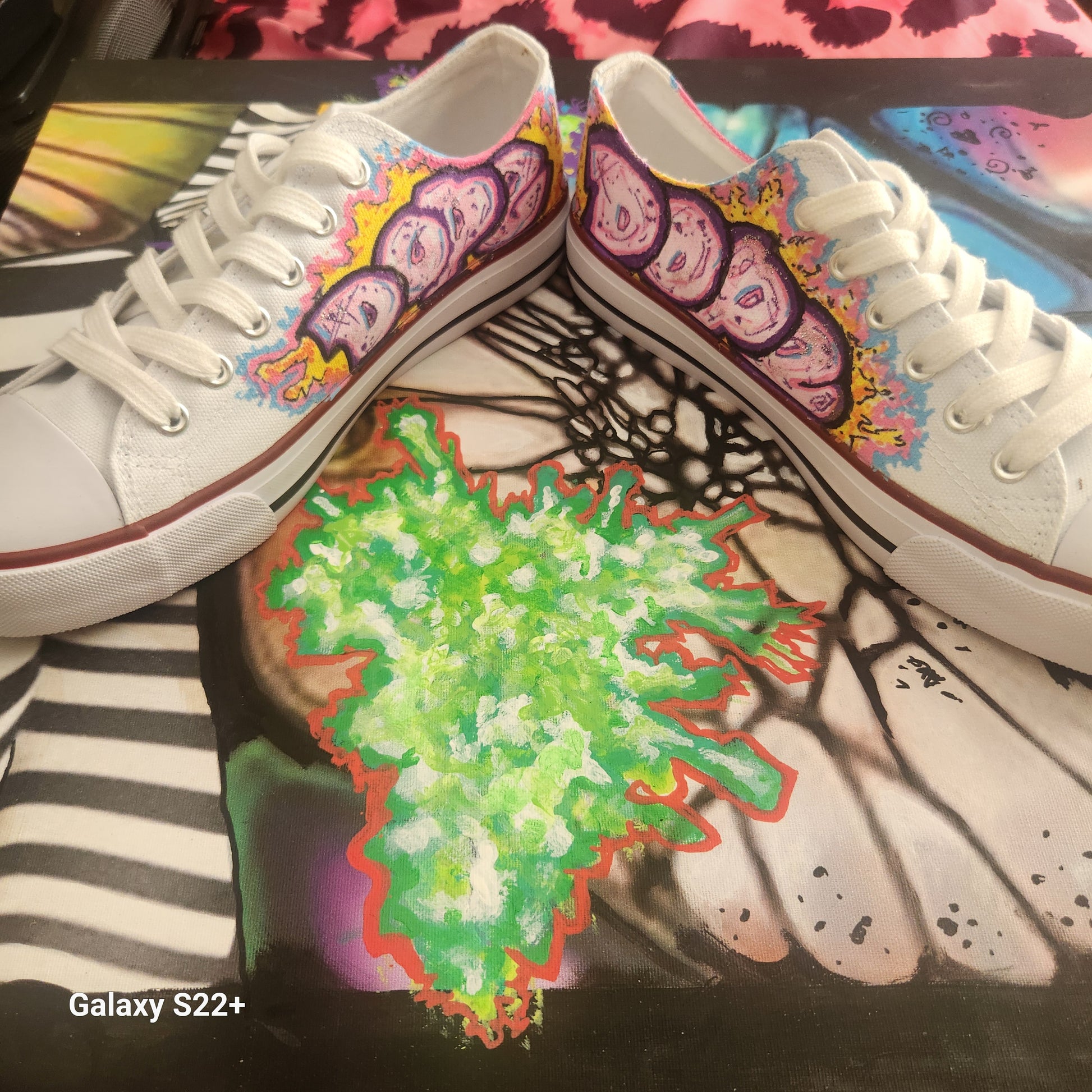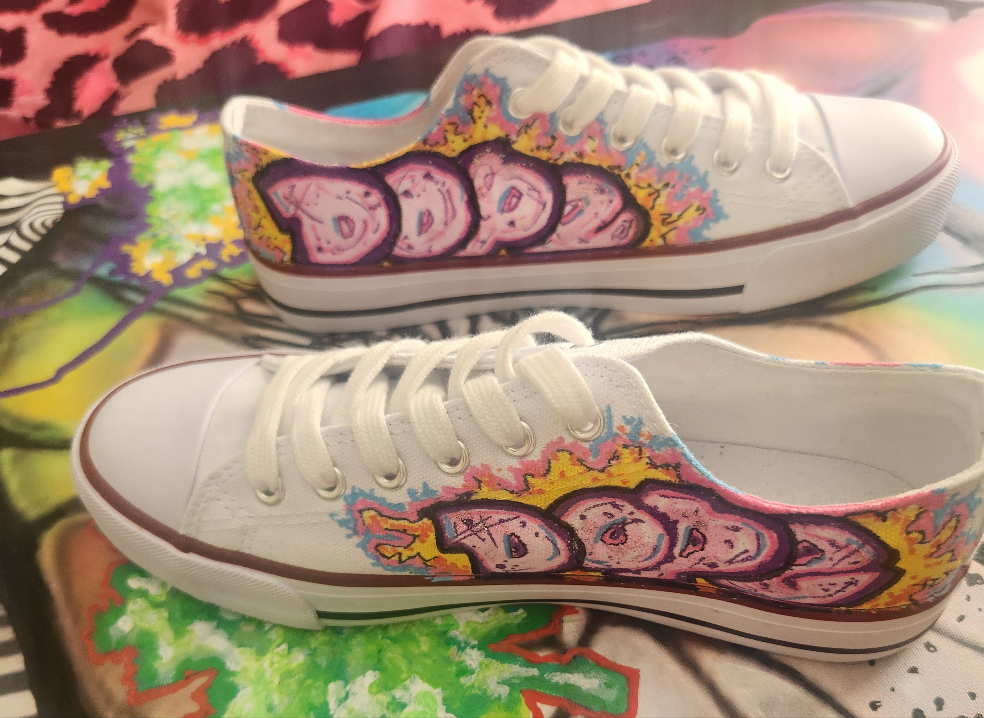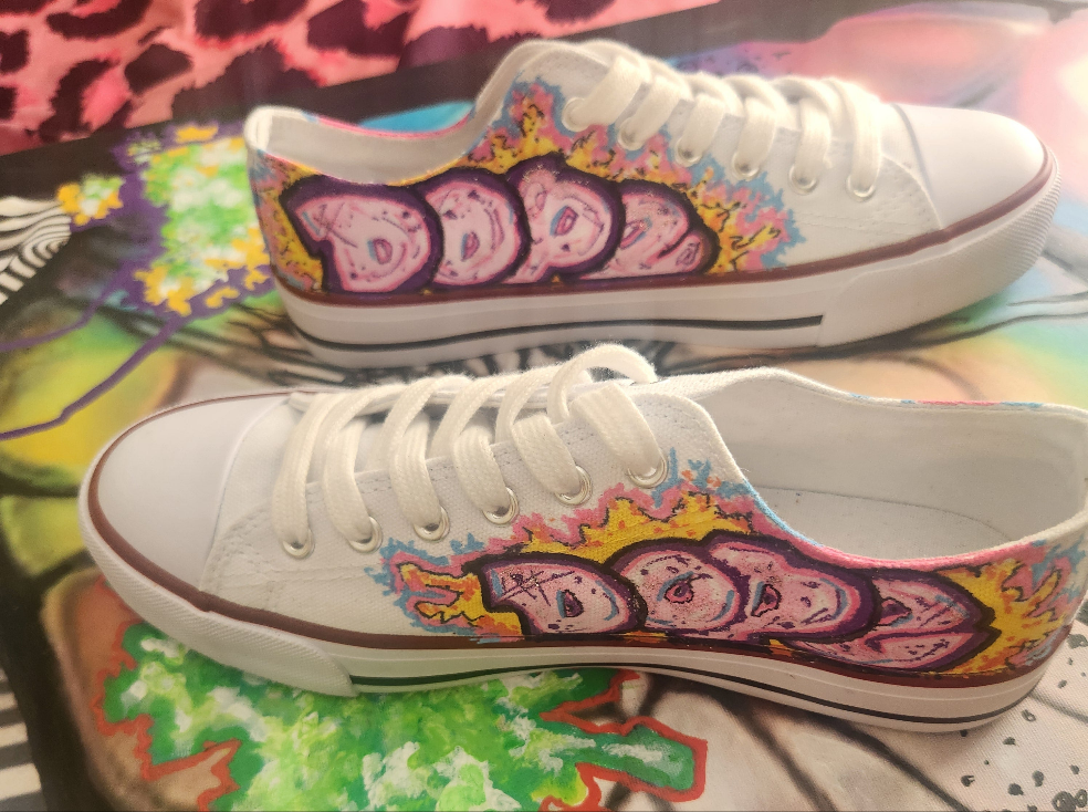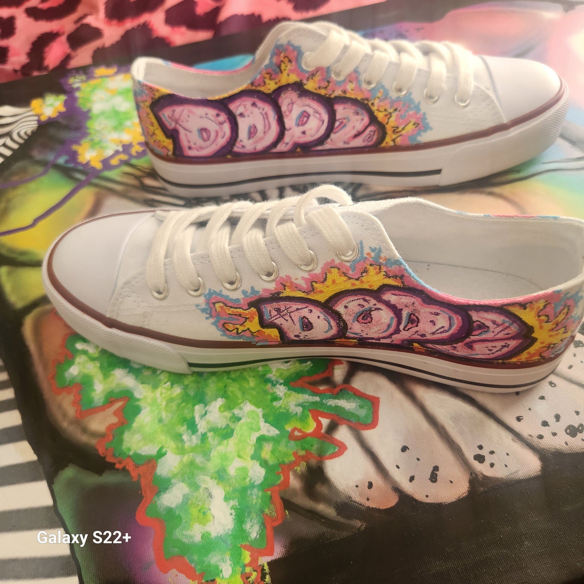 These shoez are customized with the graffitti tag of "Fresh" on outer sole and "DOPE" on instep.