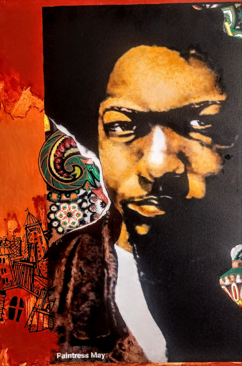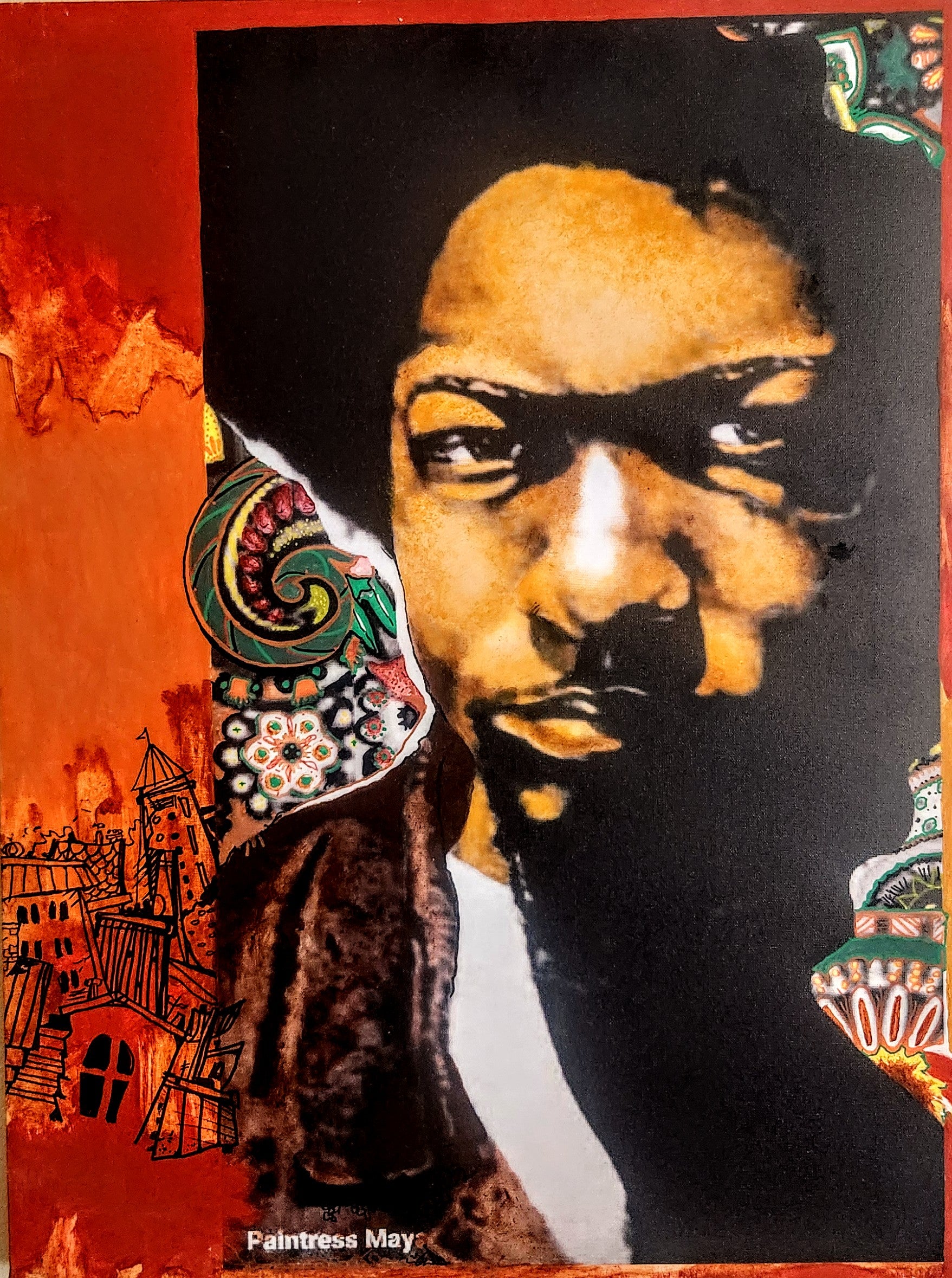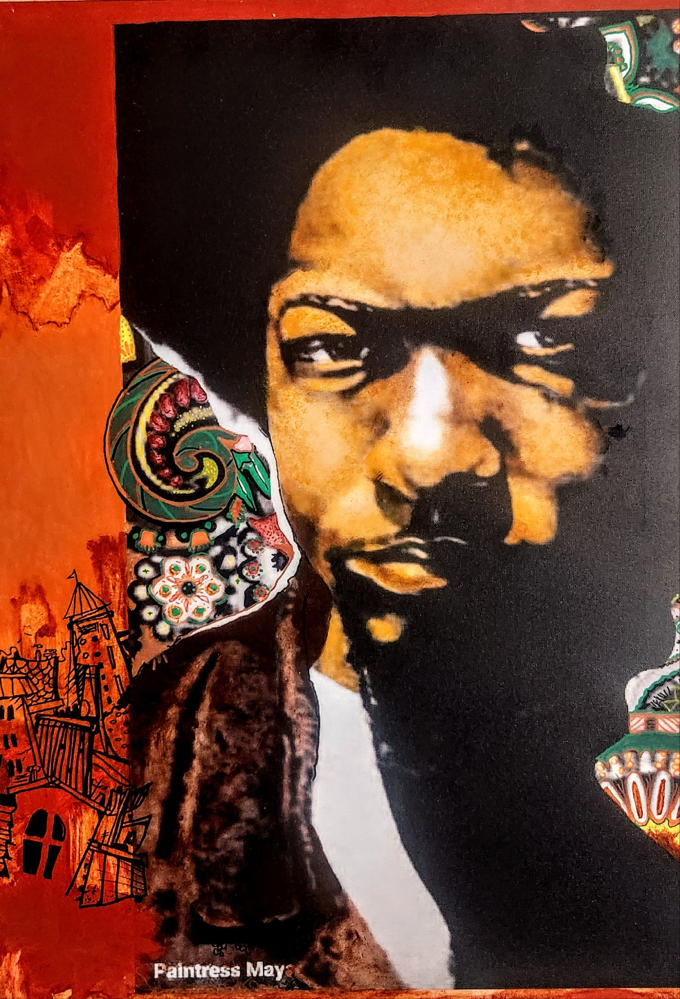 This painting showcases his stoic, hard silence as he poses for photograph.