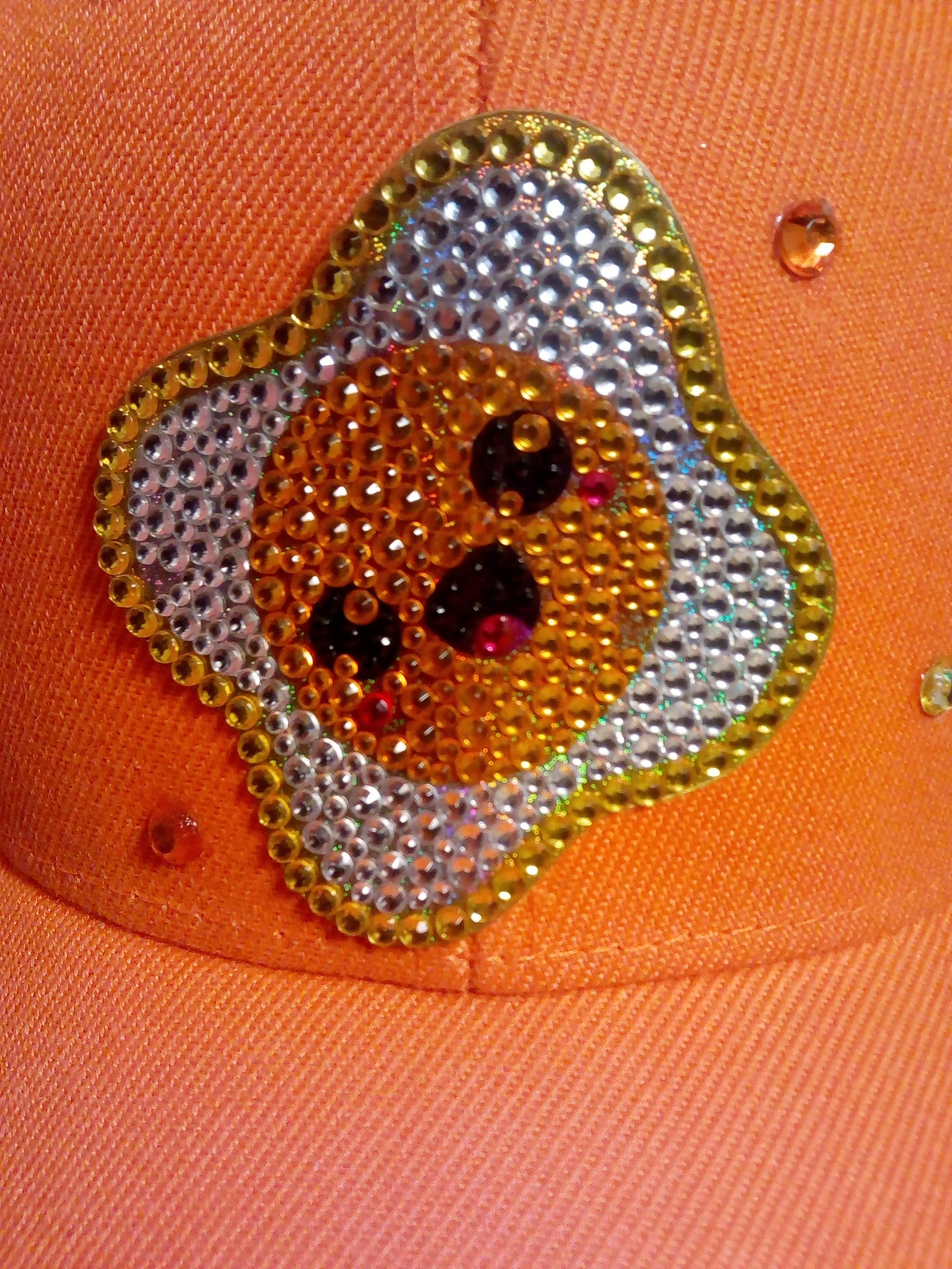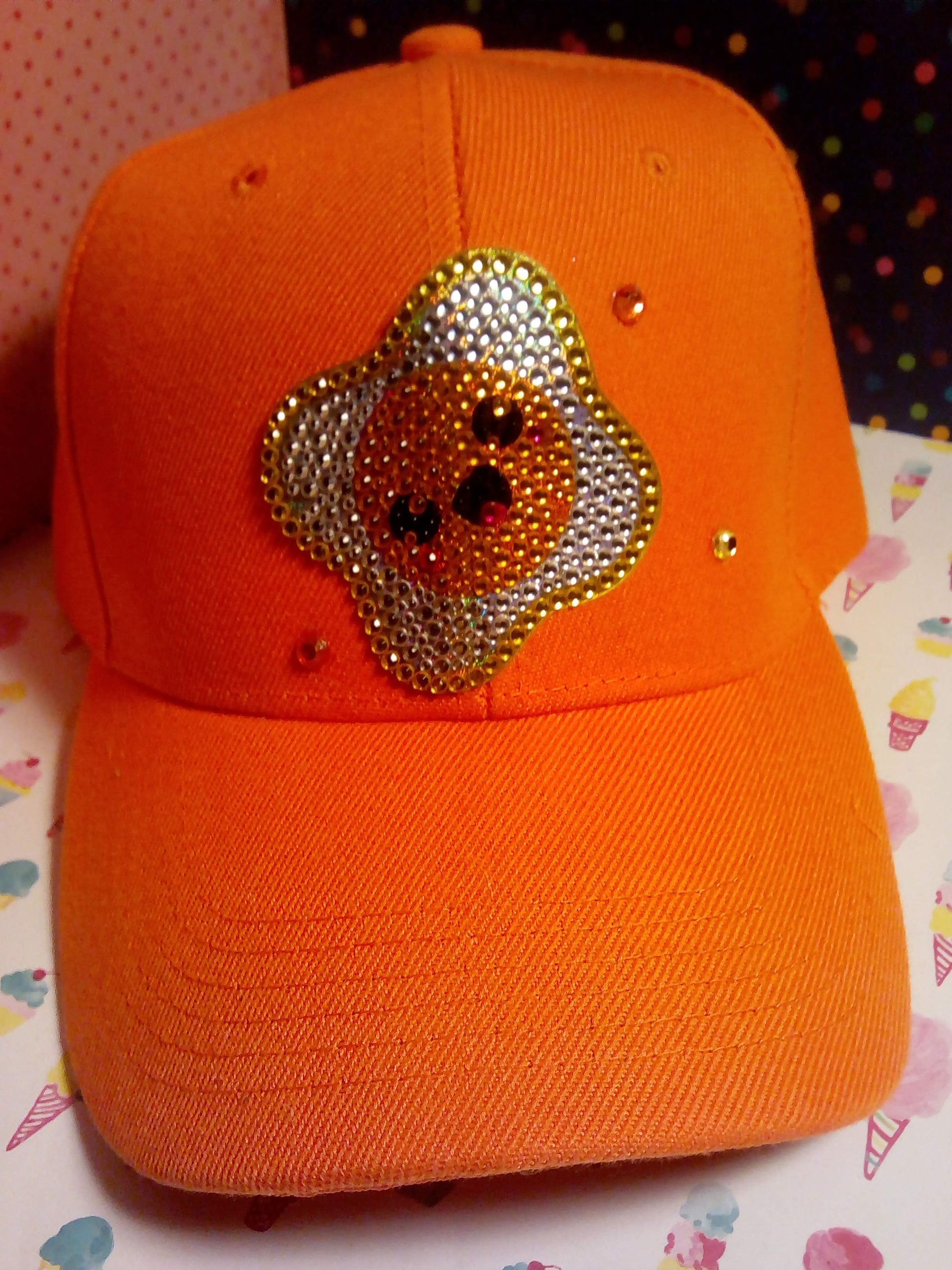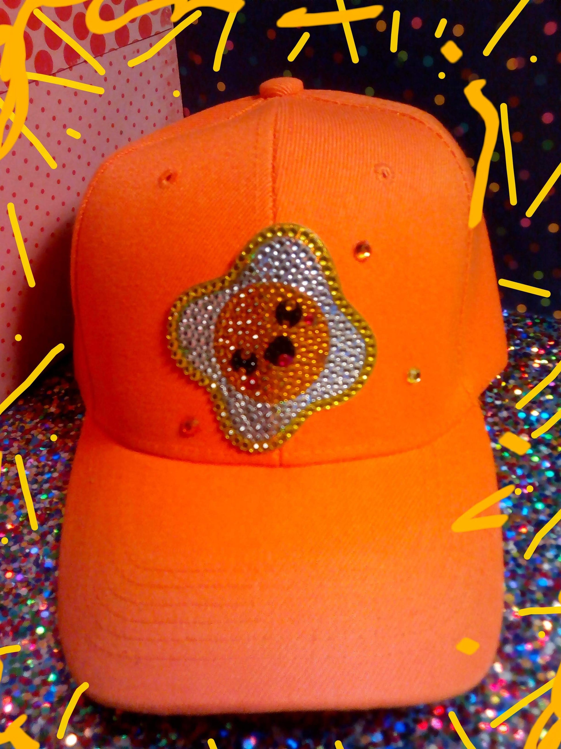 Orange 🍊 baseball cap with sequin egg yolk embroidered front detail. Embellished with glitter and REAL SWAROVSKI CRYSTALS ✨️.
