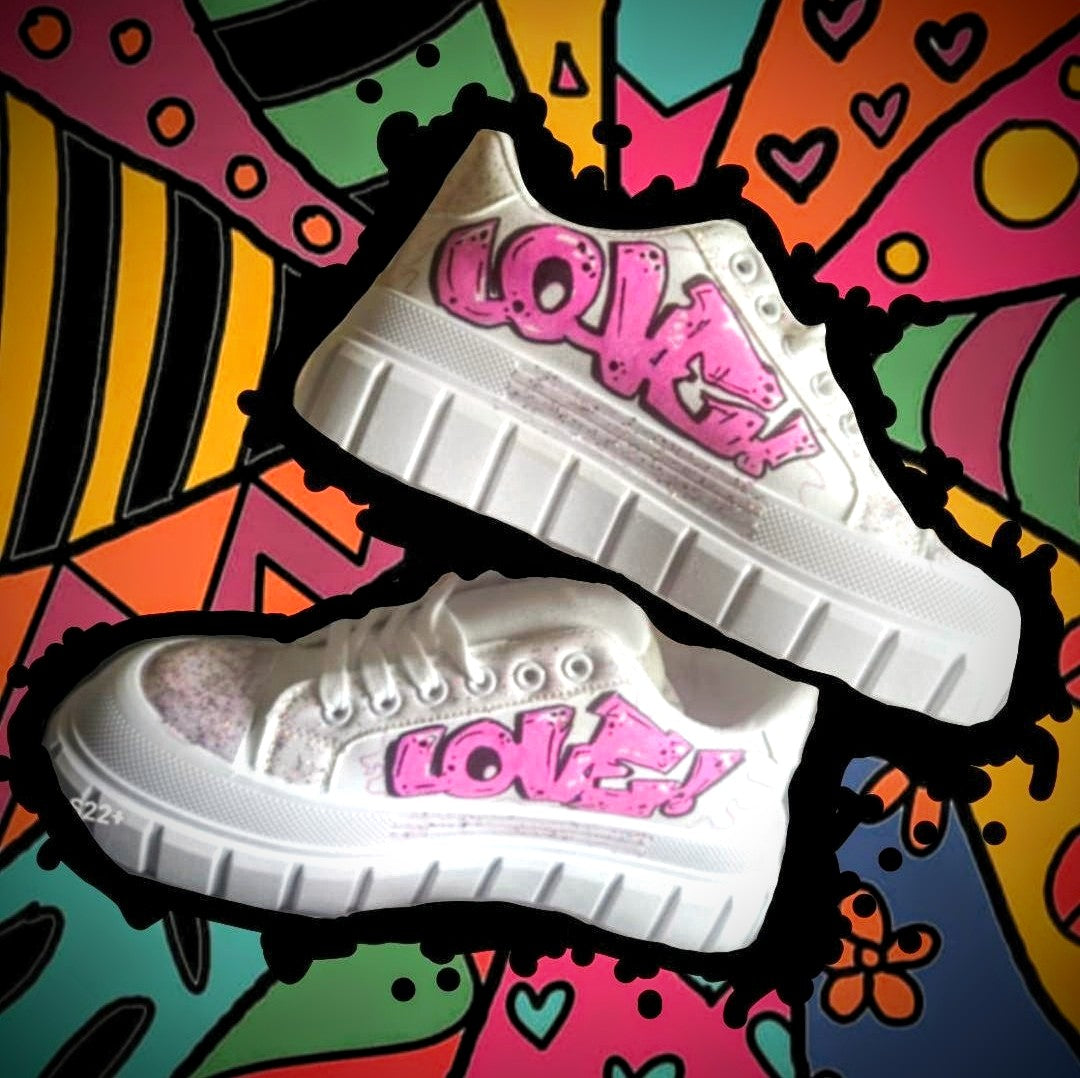 All White PU sneaker decked out with the brightest graffitti tag of "Love".