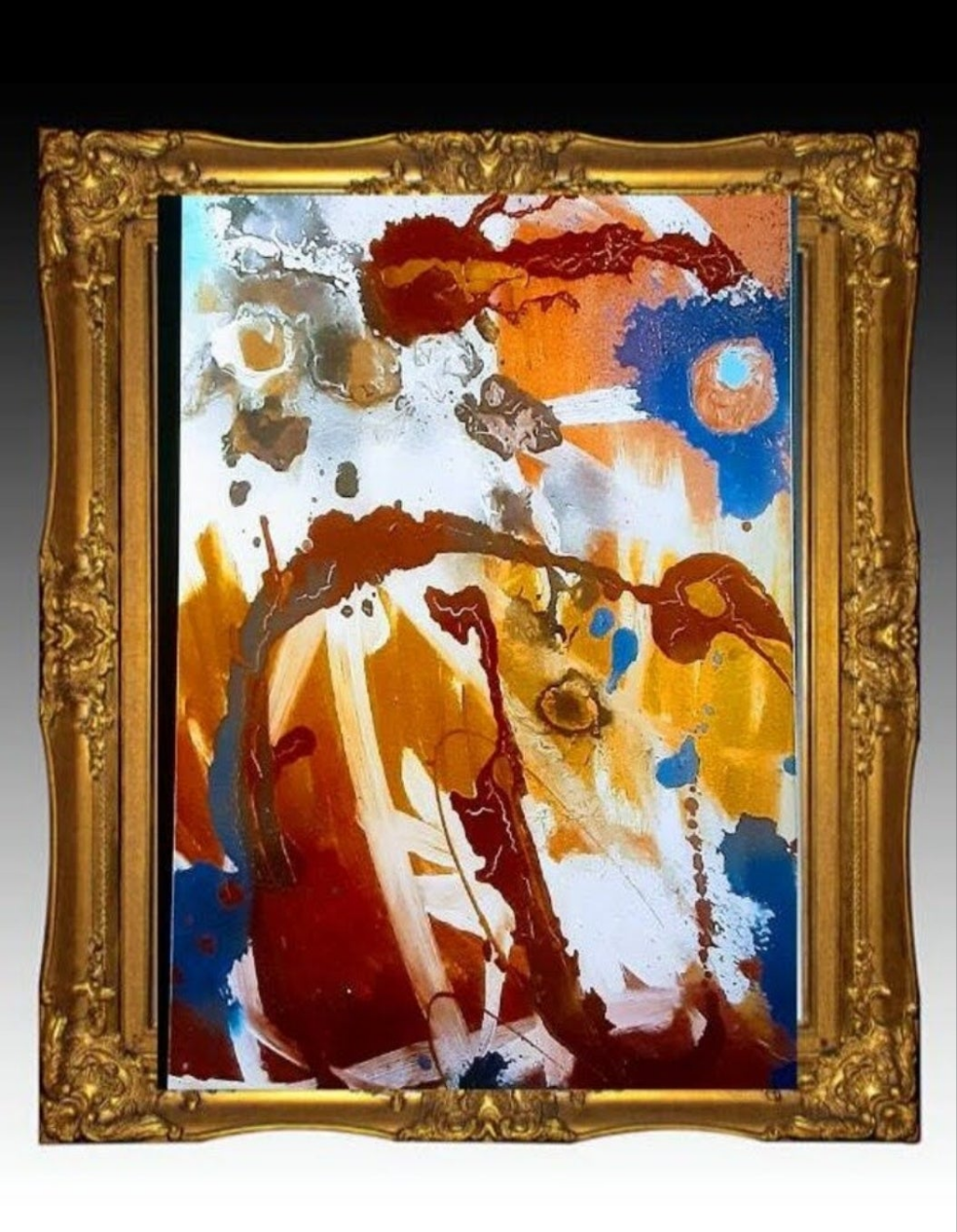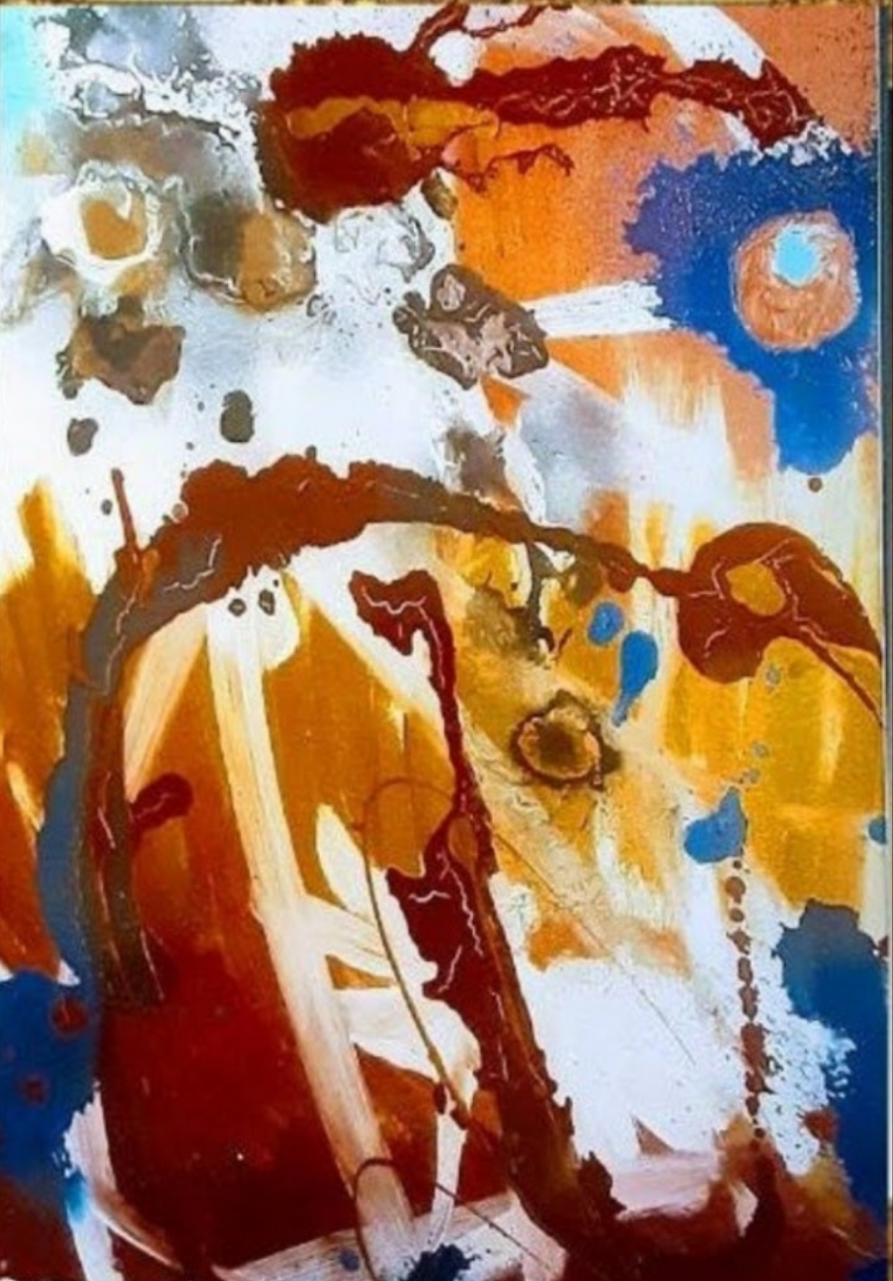 An abstract painting focusing on the magenta swoop in foreground of artistic work.