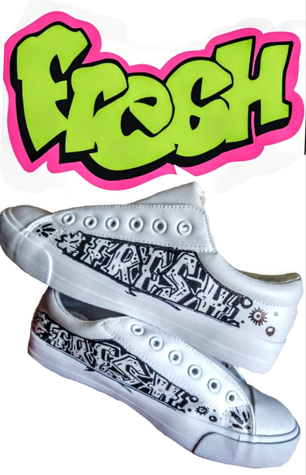 These shoez are customized with the graffitti tag of "Fresh". The image is in color on outer sole and finished in black and white on the oner sole of shoe.