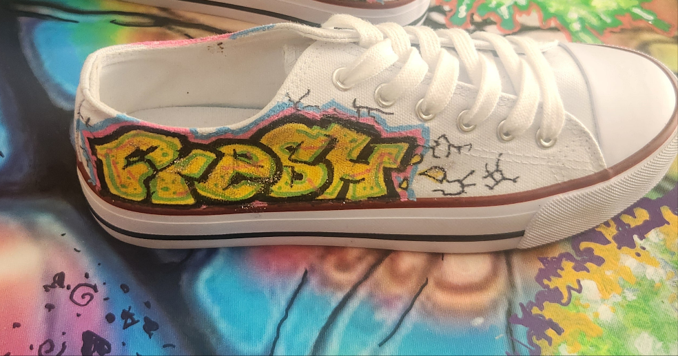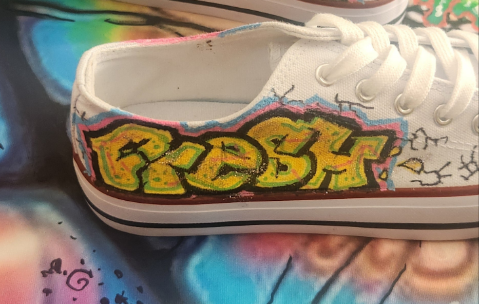 These shoez are customized with the graffitti tag of "Fresh" on outer sole and "DOPE" on instep.