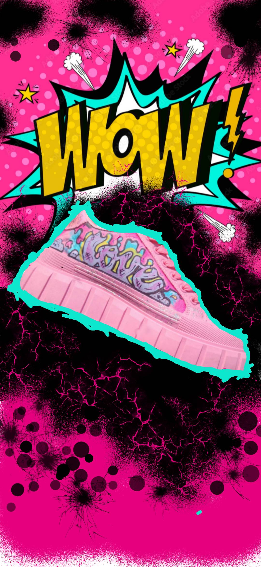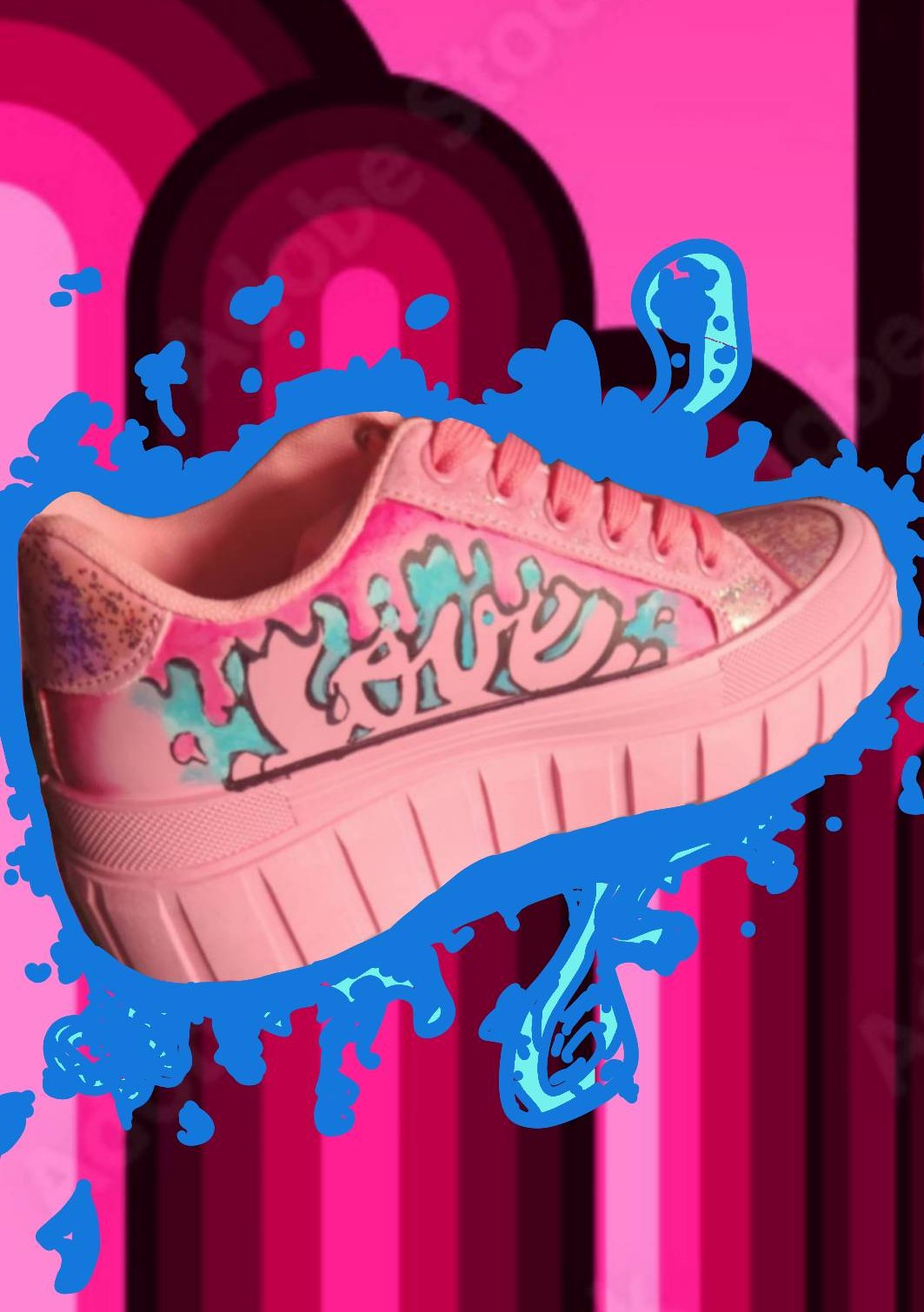 A top seller, these All Pink PU sneakers decked out with the brightest graffitti tag of "Love".