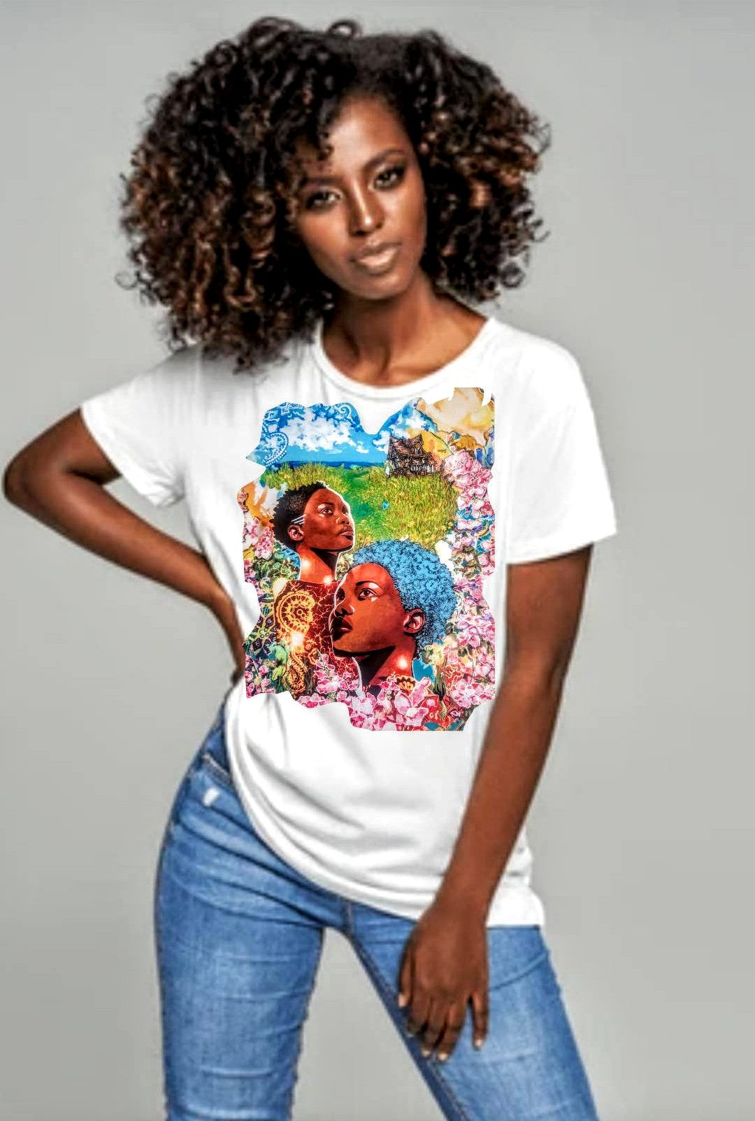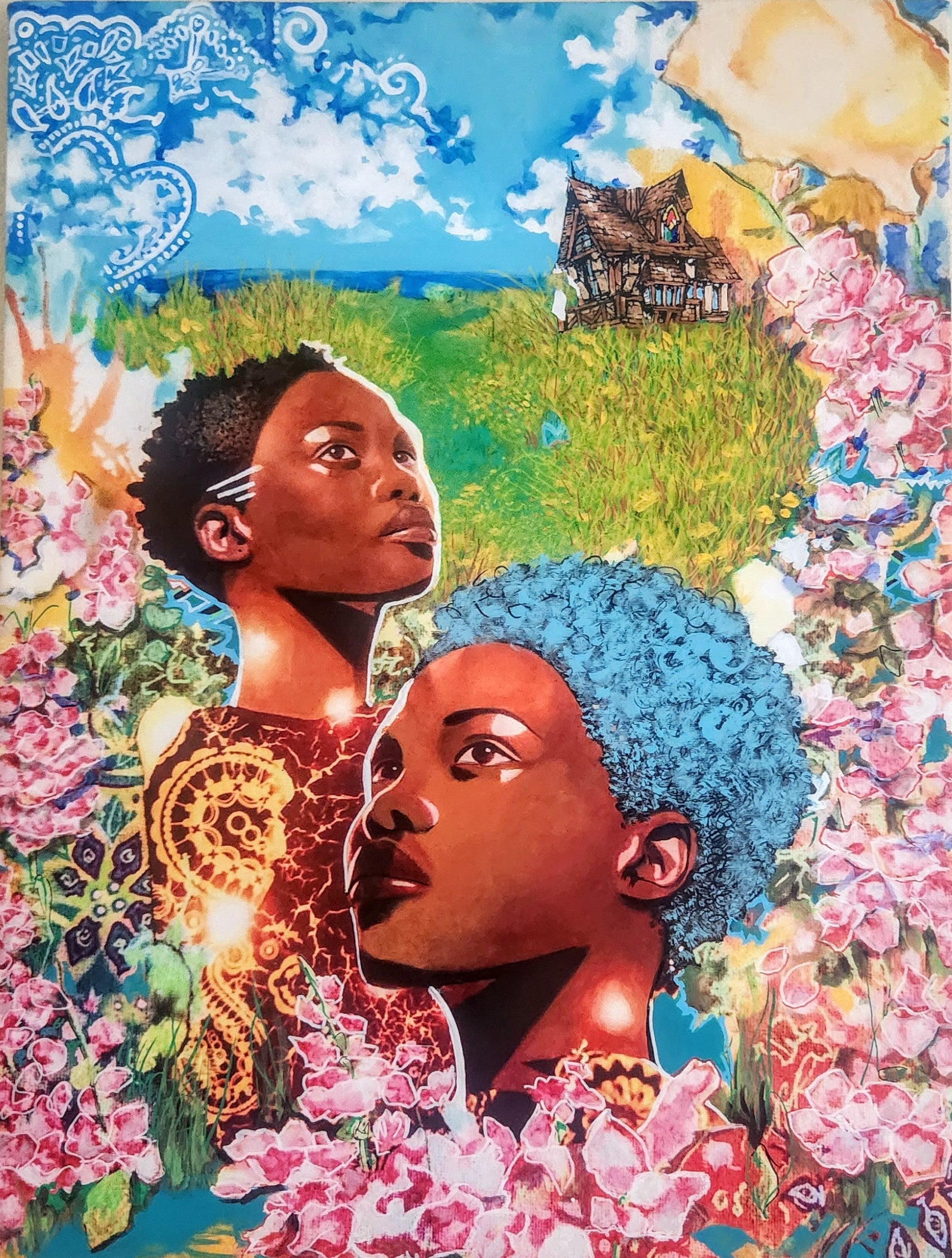 Original acrylic painting by Maya Simmons depicting a investigative sojourn of sisters into truthfulness, wholeness and talents.
