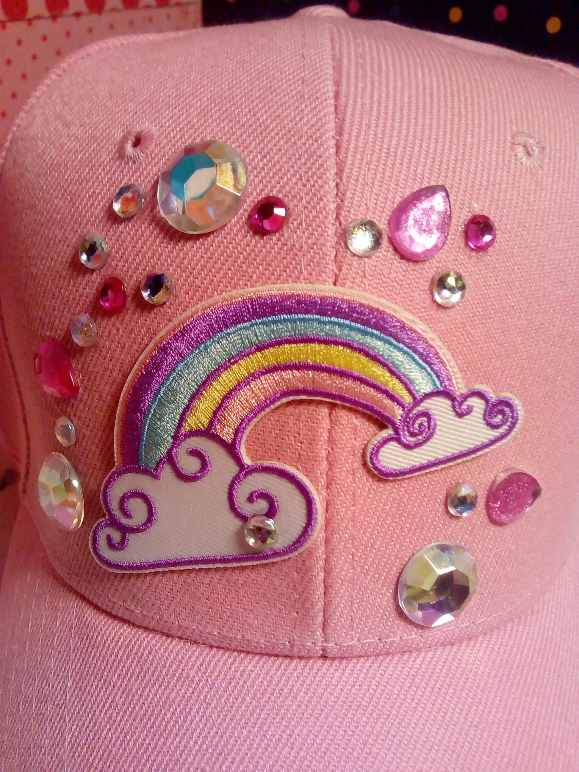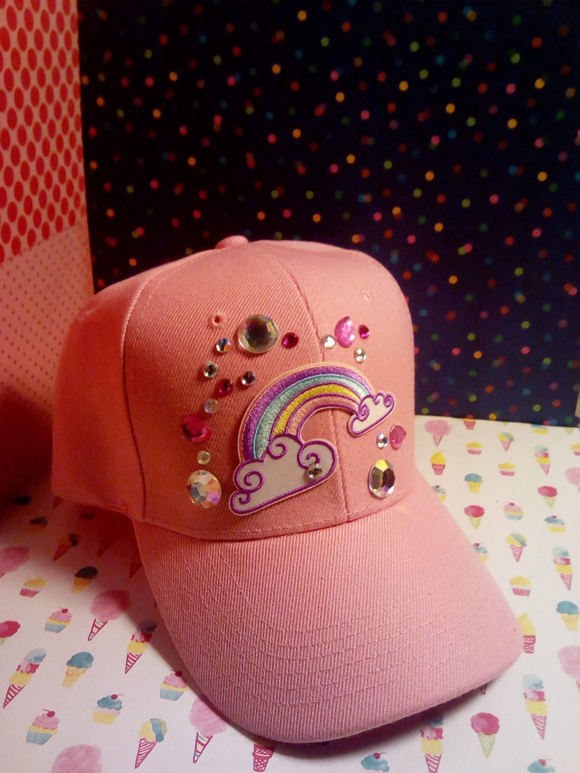 Pink baseball cap with Rainbow embroidered detail. Embellished with glitter and REAL SWAROVSKI CRYSTALS ✨️.